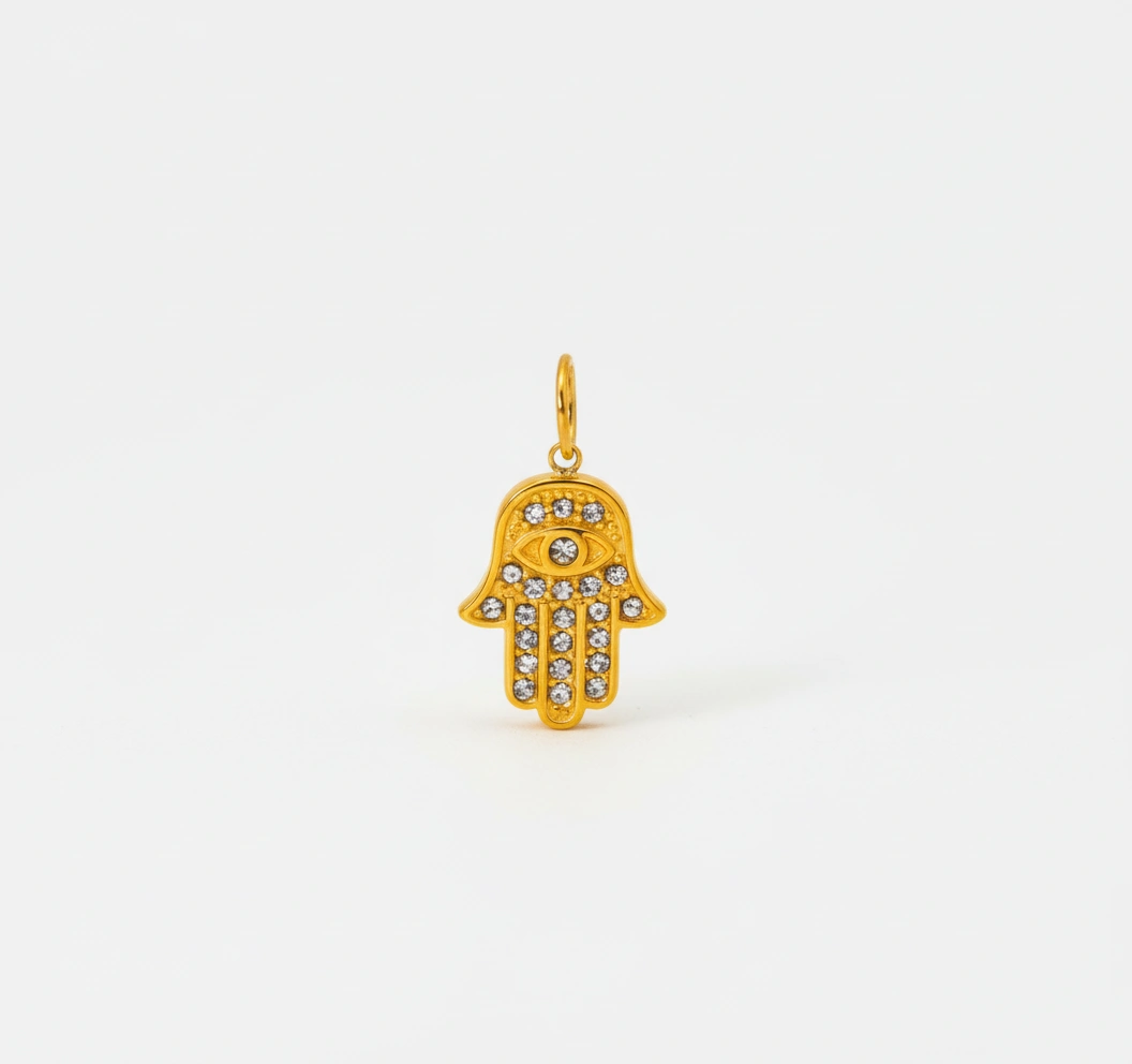 Este charm con forma de Mano de Fátima —también conocida como Hamsa— es un símbolo de protección, buena energía y equilibrio. Sus circonitas blancas añaden un brillo muy especial, creando un contraste elegante sobre el baño dorado.