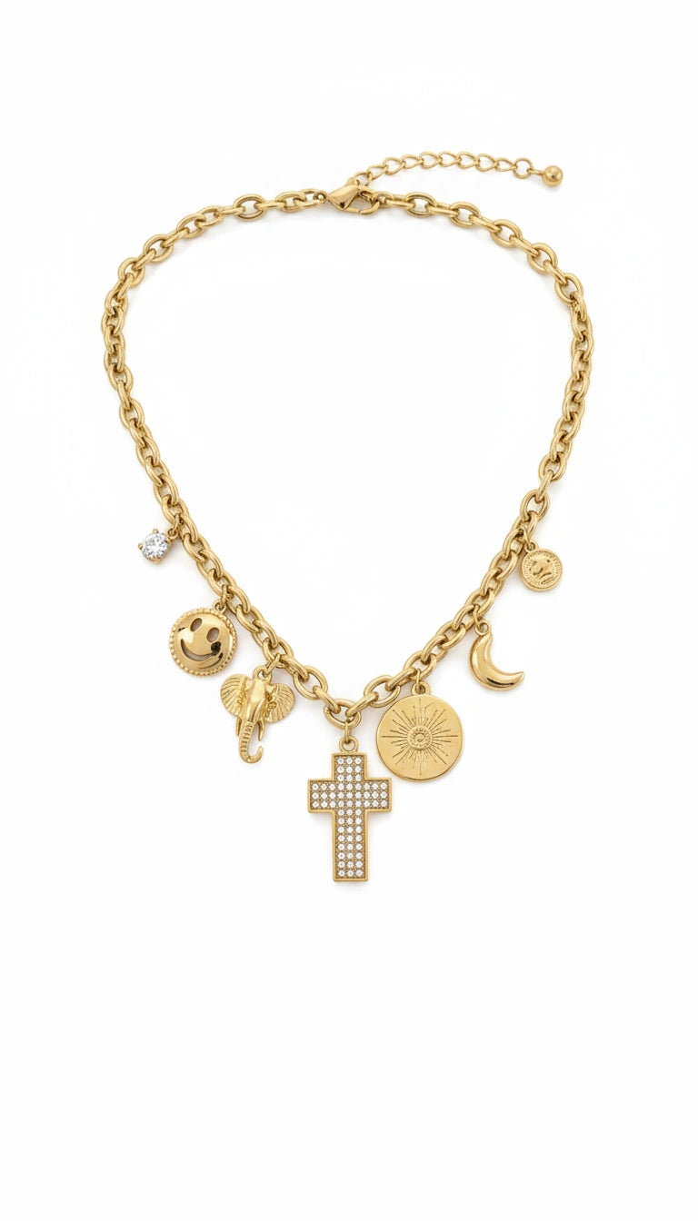Nuestro Choker Asia es una opción elegante para realzar tu estilo. Este collar cuenta con un diseño de acero chapado en oro de 18kt y encantos que le dan un toque único. Además, su material de alta calidad garantiza la durabilidad del producto. Perfecto para cualquier ocasión.