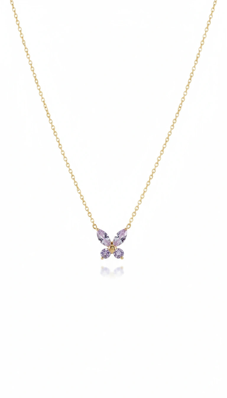 Este es un collar cero chapado en oro de 18kt con una hermosa mariposa de circonita. Añada un toque de elegancia y brillo a cualquier atuendo con este collar de alta calidad. Hecho con materiales duraderos y diseñado para durar, este collar es imprescindible para cualquier colección de joyas.
