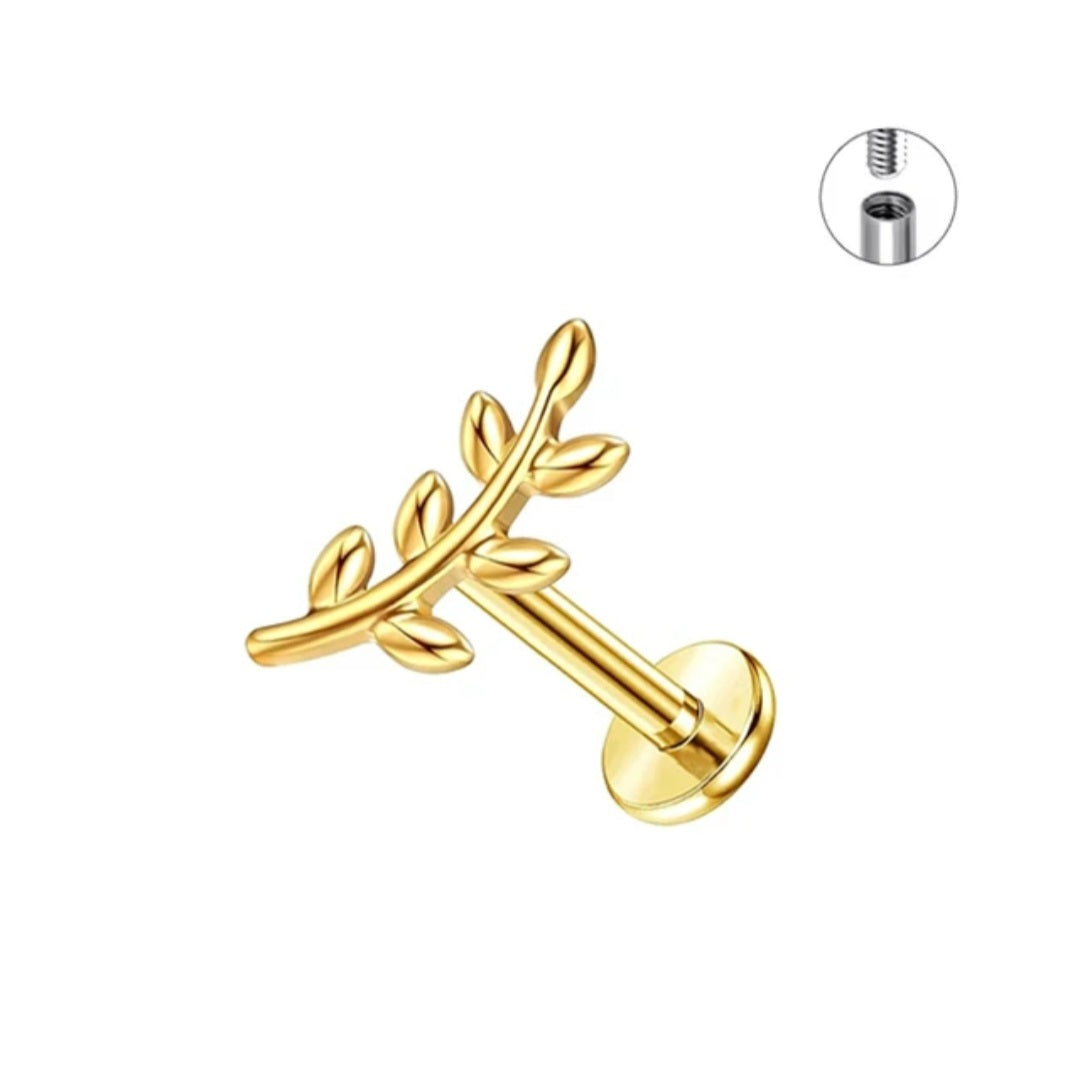 Este piercing de diseño botánico destaca por su forma de ramita dorada con pequeñas hojas, creando una pieza fina, elegante y muy actual.