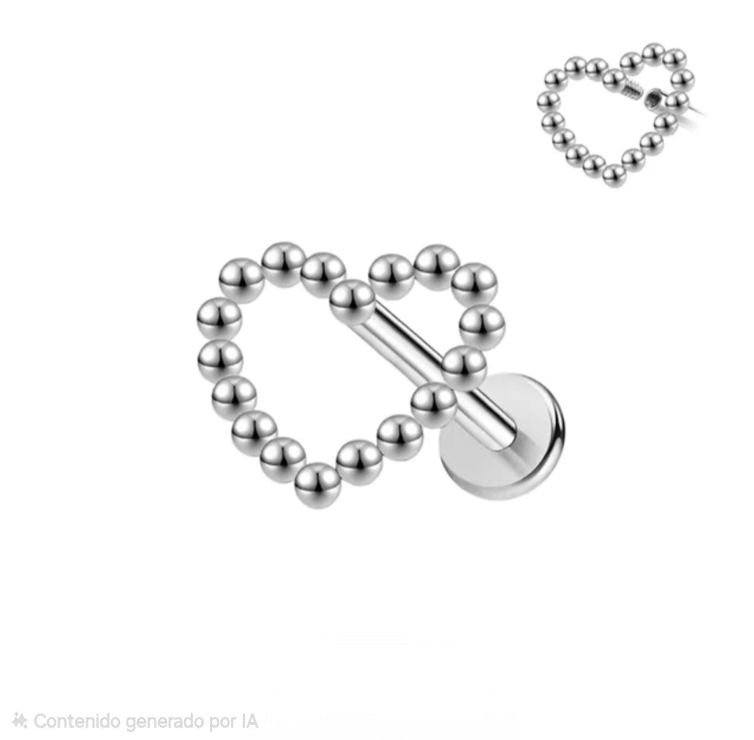Un piercing con encanto propio. Este labret en Titanio ASTM F136 destaca por su diseño en forma de corazón hecho con pequeñas bolitas, creando un look delicado, moderno y súper combinable.
